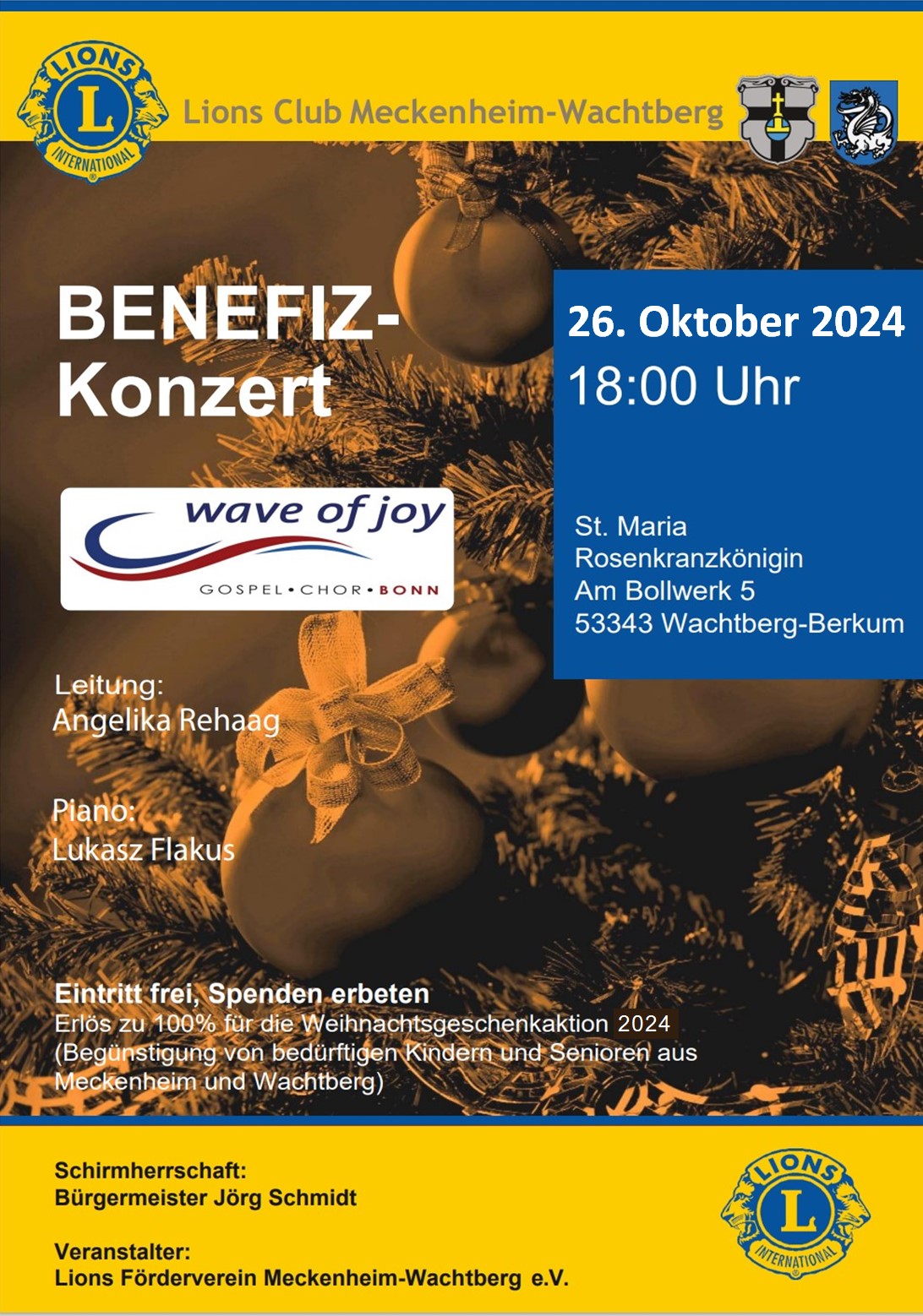 Unter der Schirmherrschaft des Wachtberger Bürgermeisters, Herrn Jörg Schmidt, verspricht der bekannte Bonner Gospelchor „Wave of Joy“ mit seiner mitreißenden Black-Gospel Musik einen  schwungvollen - aber sicher auch besinnlichen - Abend zugunsten der nunmehr 17. Weihnachtsgeschenkaktion.